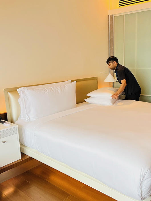 ホテルに宿泊されるゲストの方にご滞在を楽しんでいただき、ご満足いただけるよう、清潔・安全・安心を基本理念として掲げ、高品質な空間を提供することを心掛けています。