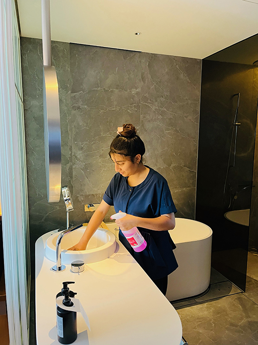 チェックアウトが12時、チェックインが15時であれば、その3時間以内で約300室を清掃しなければならないので、品質を保ちながらスピード感のあるオペレーションを行うため、スタッフ全員が一致団結して日々奮闘しています。