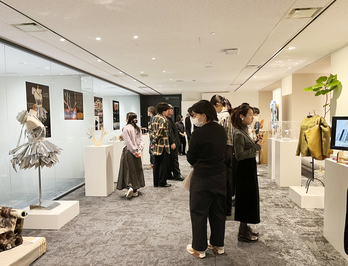会には、大阪芸術大学・大阪工業大学出身の社員(OB・OG)も参加。作者から作品についての想いや制作背景を聞き、一つひとつの作品のストーリーを確認しながら、後輩たちの力作を熱心に鑑賞しました。学生さんからは「普段はこのようにたくさんの材料を使える機会がなく、当社からの端材の提供によって作品の幅が広がった」と感謝の言葉をいただきました。