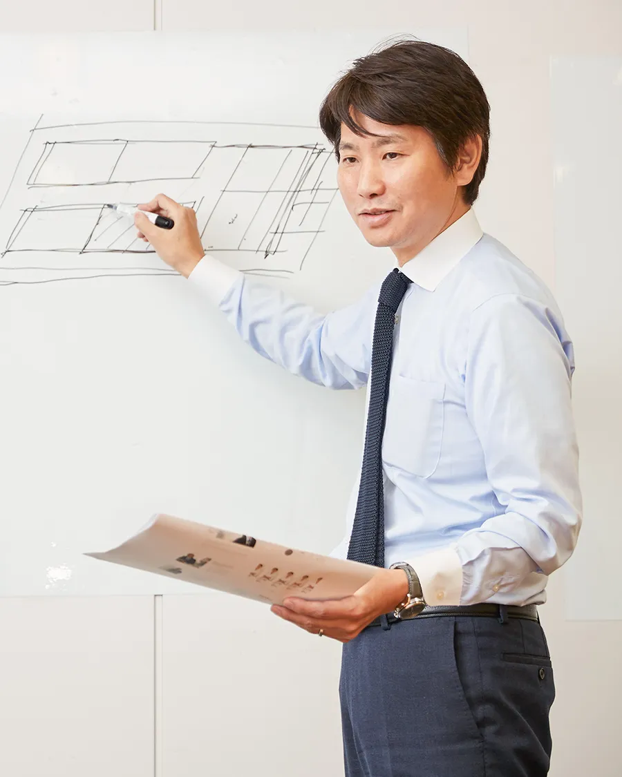 店舗や施設の内装工事を請け負うスペースプロダクト部をマネジメントする立場となり、これまでより広く長期的な視野で部の戦略を立て、部下が働きやすい環境づくりを行なう。キャリアの幅を広めつつ、マネジメントとしてのキャリアを深める。