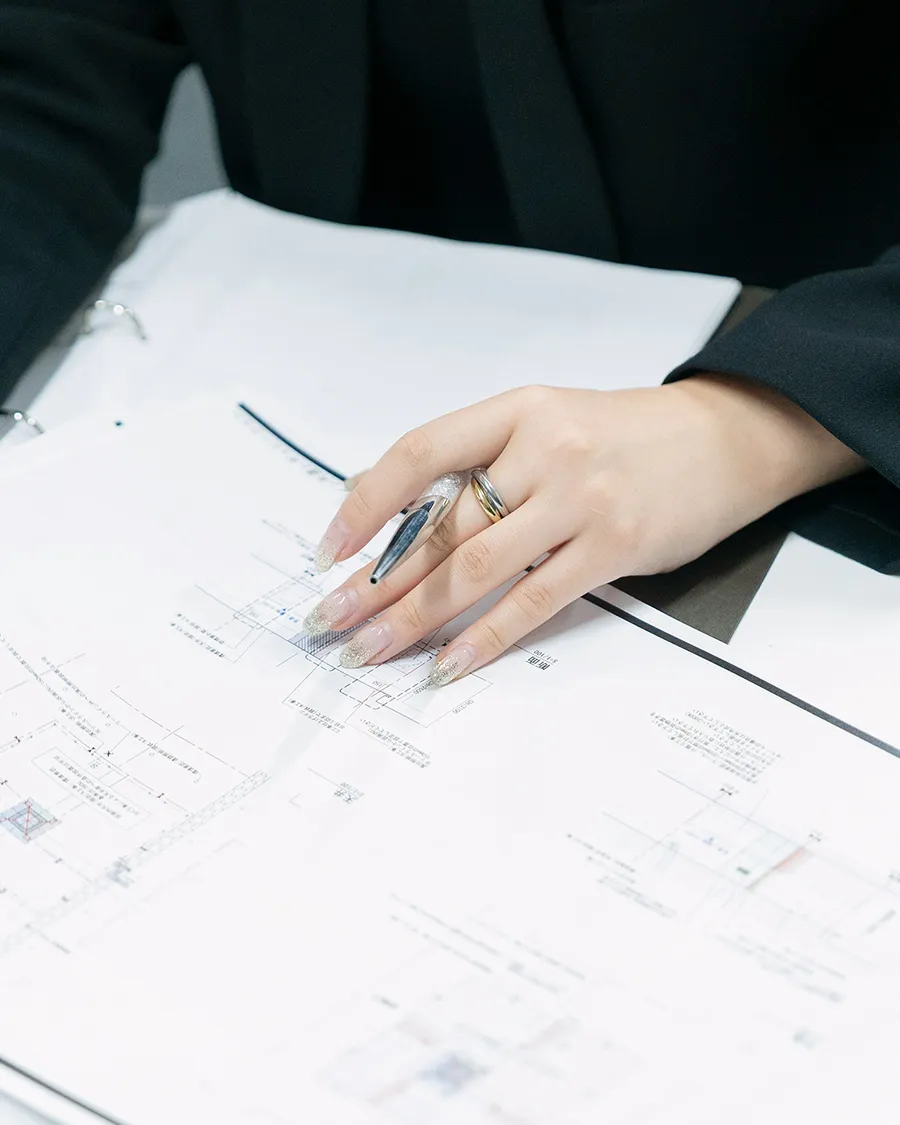このような内装監理の仕事は、マニュアルもありません。新卒の女性社員がこの部署に配属されるのは私が初めてのことだったので、当時は先輩の背中を見て覚えるしかない状況でした。初めは戸惑いましたが、自分から積極的に先輩に話しかけ、良いところは取り入れるなど試行錯誤しました。